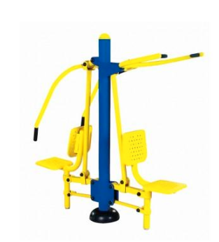 蹬腿器由一个铁架及几个朝着不同方向的铁杆组成。铁杆的下端焊接有一个铁块,虽然上面加装了橡胶套,但当铁杆落下时,铁块还是会重重砸在铁架上,如若孩子从周围靠近并碰触铁架,后果不堪设想。