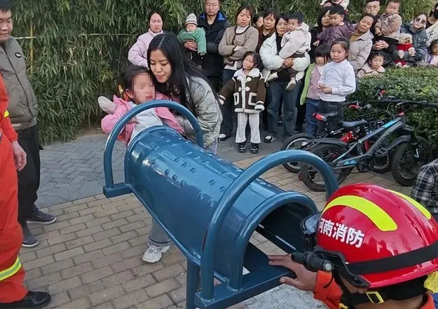 2024年12月1日,河南洛阳一广场上,一名6岁儿童在玩耍时钻入一健身器材内,不料腿部被卡在健身器材的缝隙中,无法自行抽出。